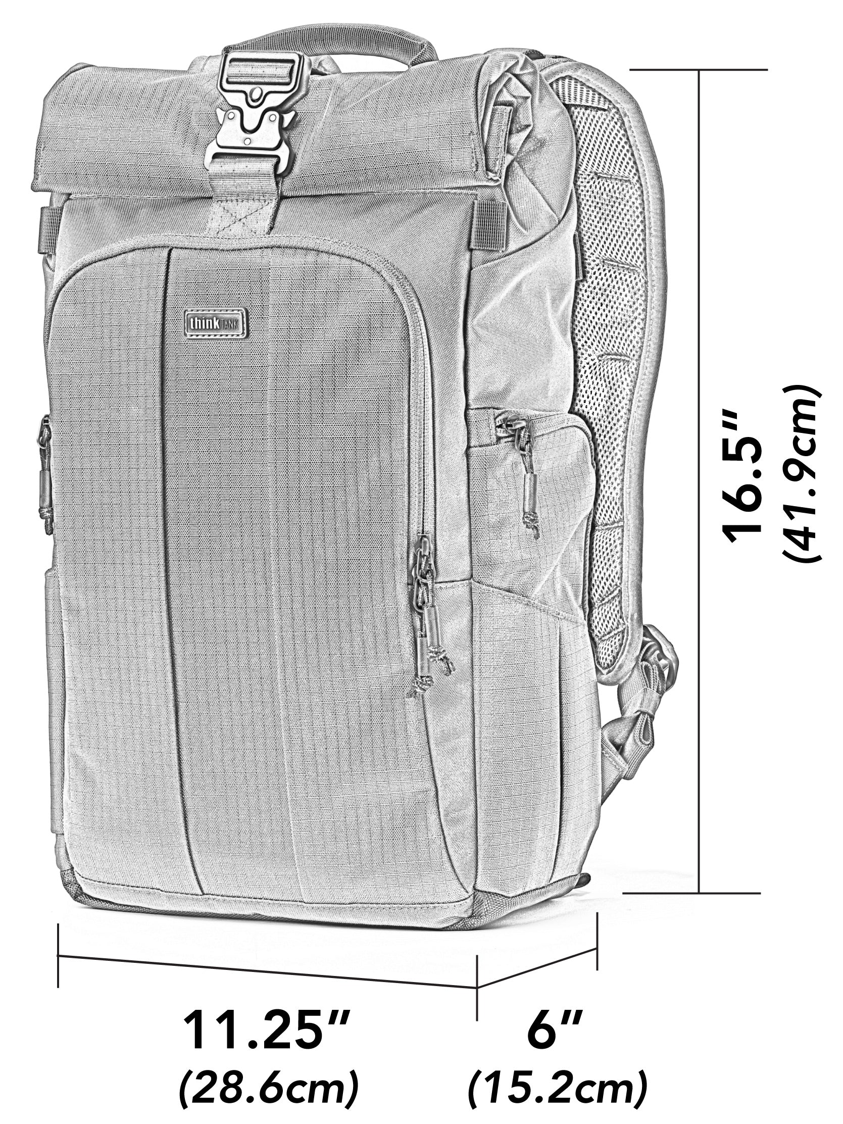 Dış ölçüler 28.6 × 41.9 × 15.2 cm (11.25” × 16.5” × 6”), fotoğraf içliği 23.5 × 24.1 × 9.5 cm (9.25” × 9.5” × 3.75”), laptop bölmesi 22.2 × 34.3 × 1.9 cm (8.75” × 13.5” × 0.75”). Ağırlık 1.62 kg (içlik, bölücüler, tripod kayışı, bel kayışı, yağmurluk dahil); minimum 1.26 kg. Hacim 23 L (içlik çıkarılmış, genişletilmiş) / 20.5 L (içlikle, genişletilmiş).