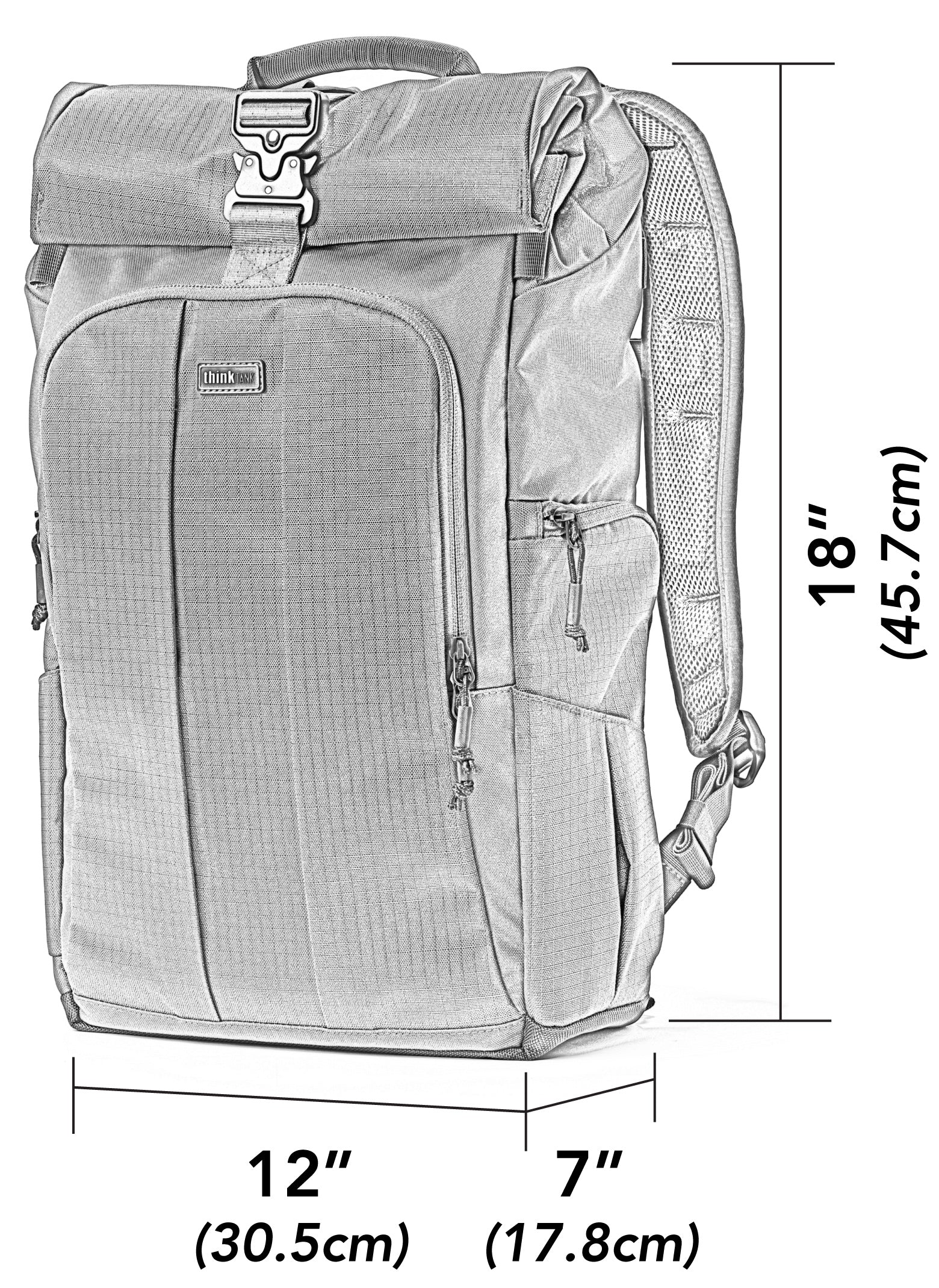 Dış ölçüler 12” × 18” × 7” (30.5 × 45.7 × 17.8 cm), fotoğraf içliği 10” × 10” × 4.5” (25.4 × 25.4 × 11.4 cm), laptop bölmesi 10” × 14.5” × 0.75” (25.4 × 36.8 × 1.9 cm). Ağırlık 1.76 kg (aksesuarlarla), minimum 1.36 kg. Hacim 31 L (içlik çıkarılmış) / 25.5 L (içlikle, genişletilmiş).